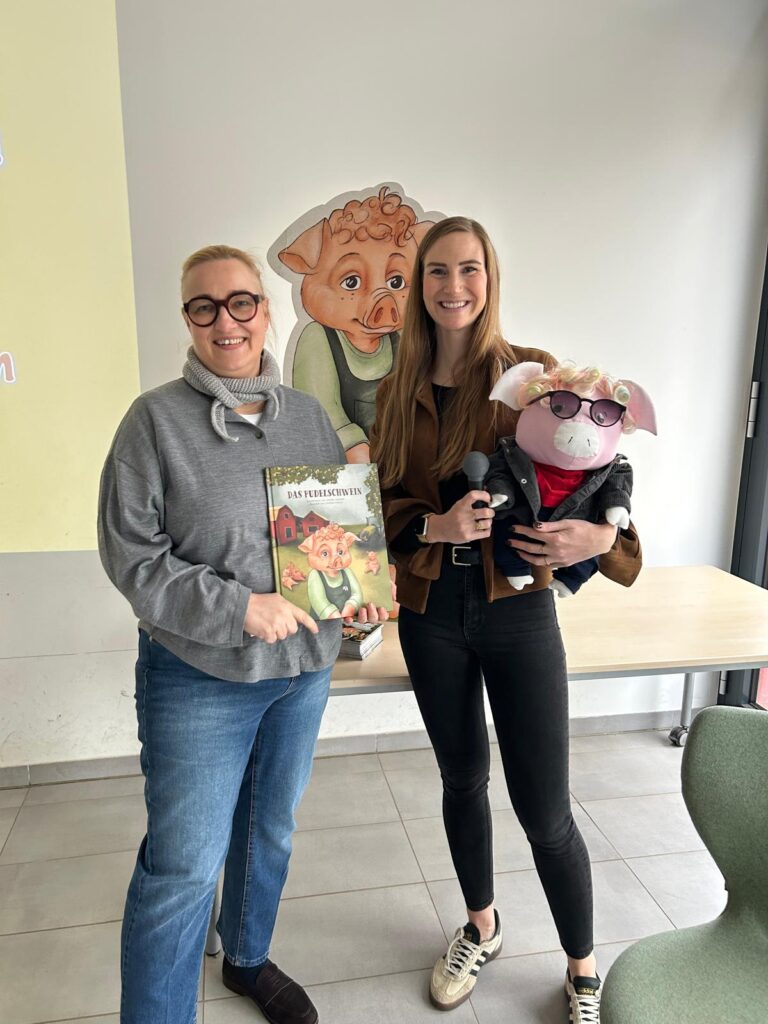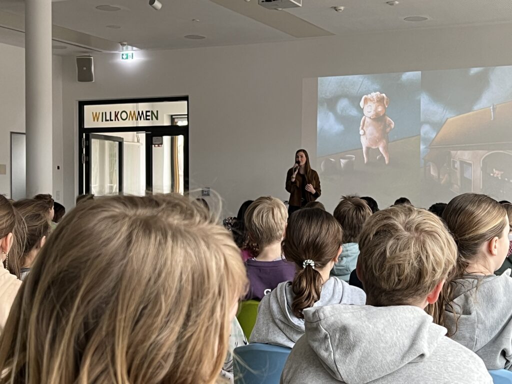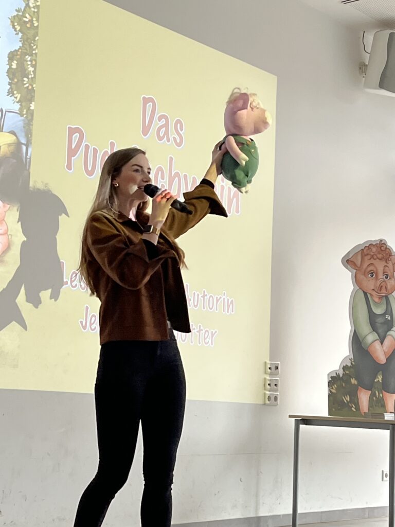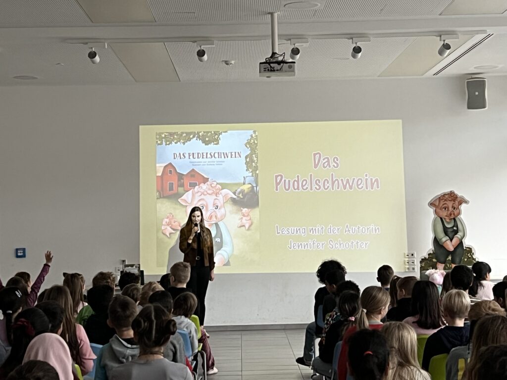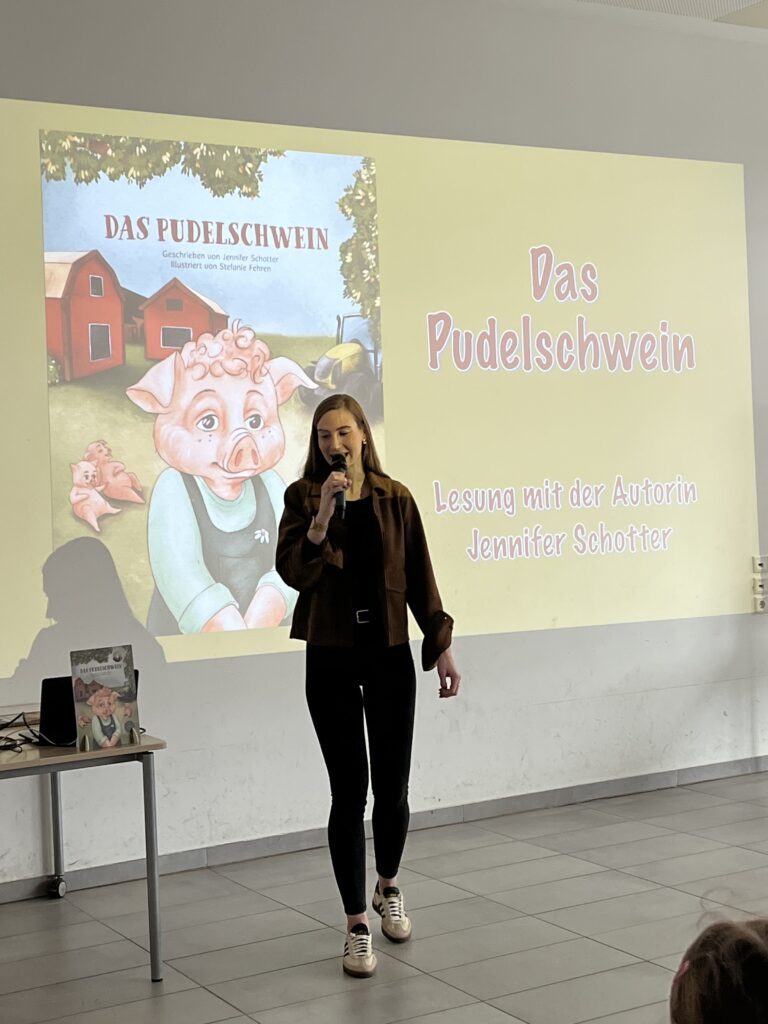 Am 13.03.2026 war die Osnabrücker Kinderbuchautorin Jennifer Schotter zu Gast, um aus ihrem Erstlingswerk „Das Pudelschwein“ zu lesen. In dem Buch geht es um das Schwein Pu, das sich auf dem Hof des Bauern nicht richtig zugehörig fühlt. Auf der Suche nach einem Ort, an dem man ihn so mag, wie er ist, verlässt Pu den Hof und …. (mehr soll hier nicht verraten werden). In einer multimedialen Lesung traf Frau Schotter mit ihrer Geschichte über Anderssein und Mut sehr den Nerv unserer Erst- bis Viertklässler. Zum Abschluss bekam jeder noch eine Autogrammkarte der Autorin.
