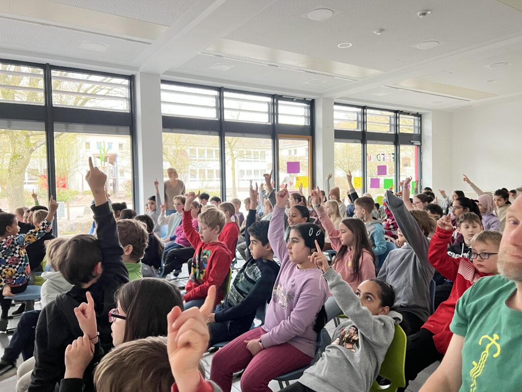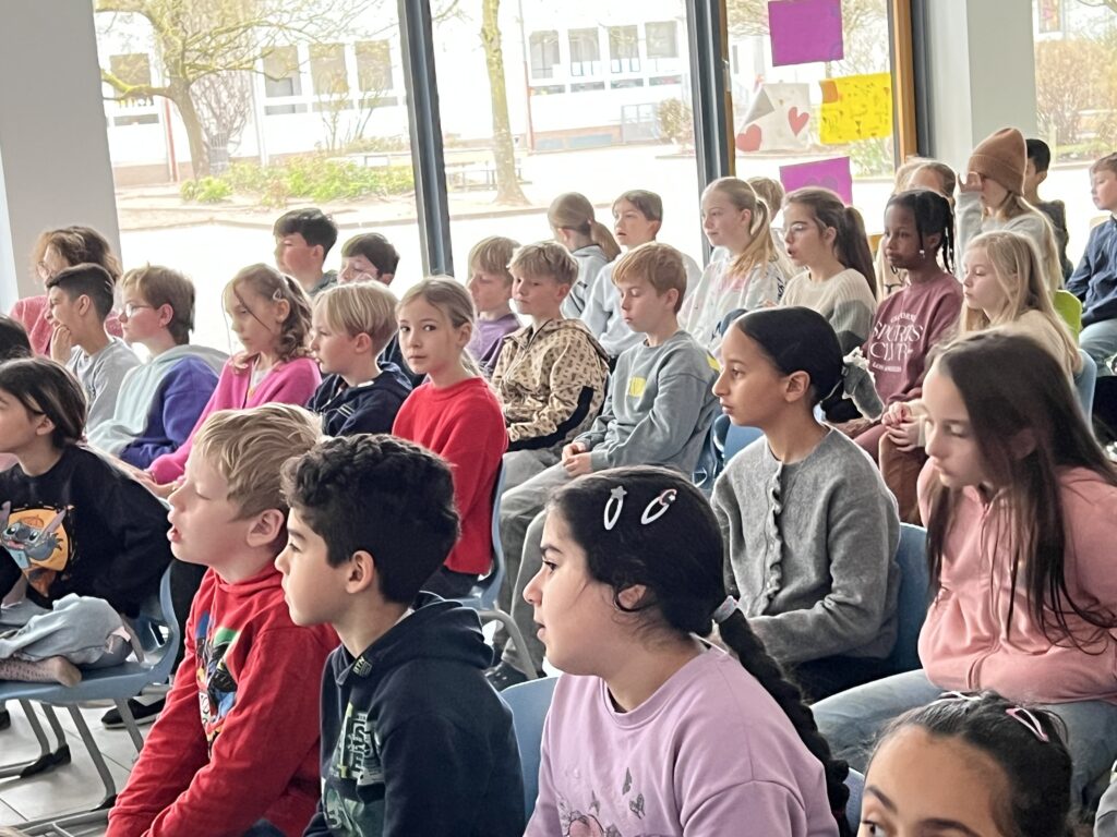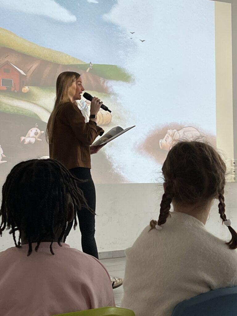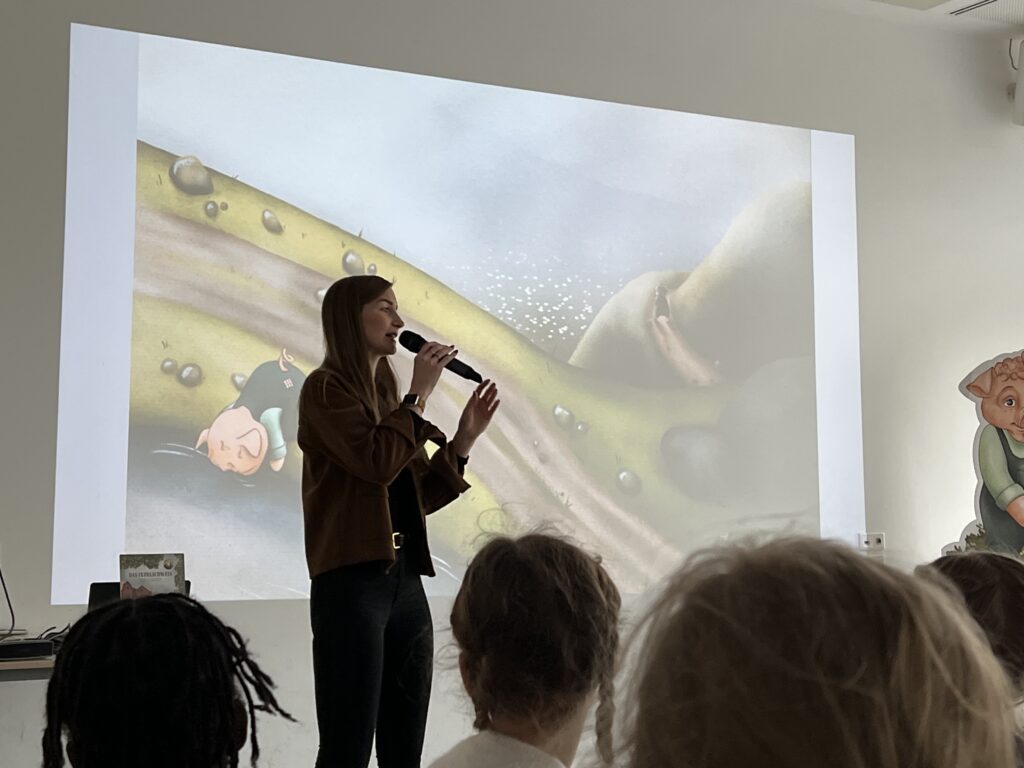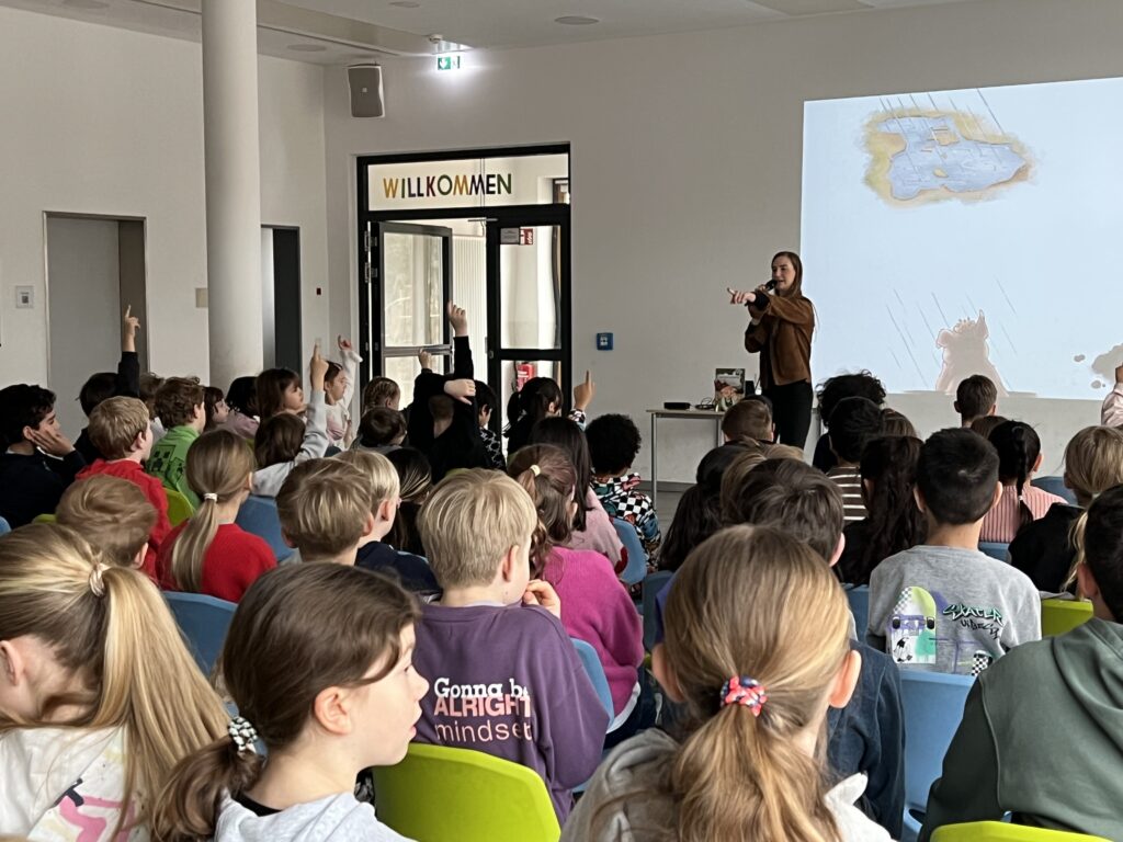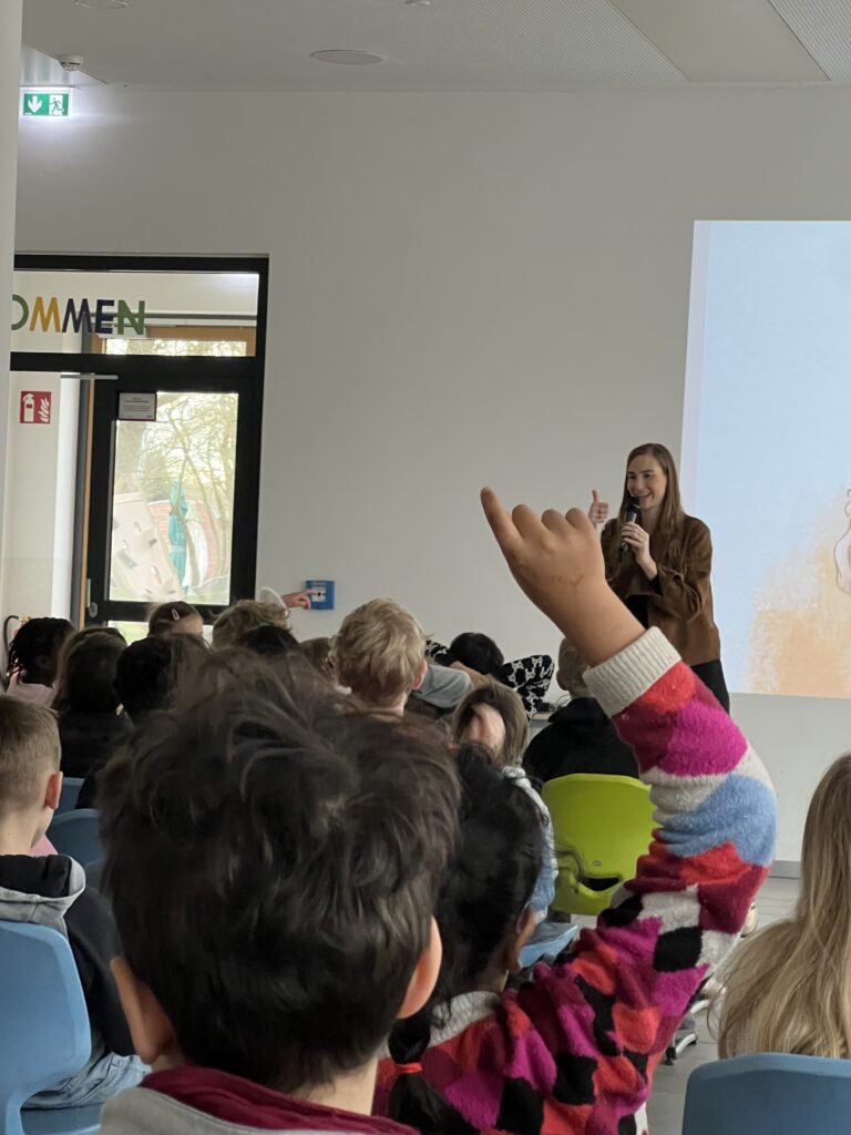 Am 13.03.2026 war die Osnabrücker Kinderbuchautorin Jennifer Schotter zu Gast, um aus ihrem Erstlingswerk „Das Pudelschwein“ zu lesen. In dem Buch geht es um das Schwein Pu, das sich auf dem Hof des Bauern nicht richtig zugehörig fühlt. Auf der Suche nach einem Ort, an dem man ihn so mag, wie er ist, verlässt Pu den Hof und …. (mehr soll hier nicht verraten werden). In einer multimedialen Lesung traf Frau Schotter mit ihrer Geschichte über Anderssein und Mut sehr den Nerv unserer Erst- bis Viertklässler. Zum Abschluss bekam jeder noch eine Autogrammkarte der Autorin.