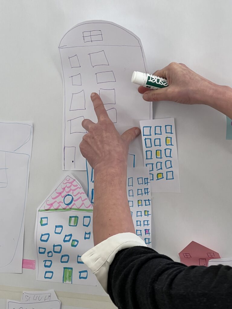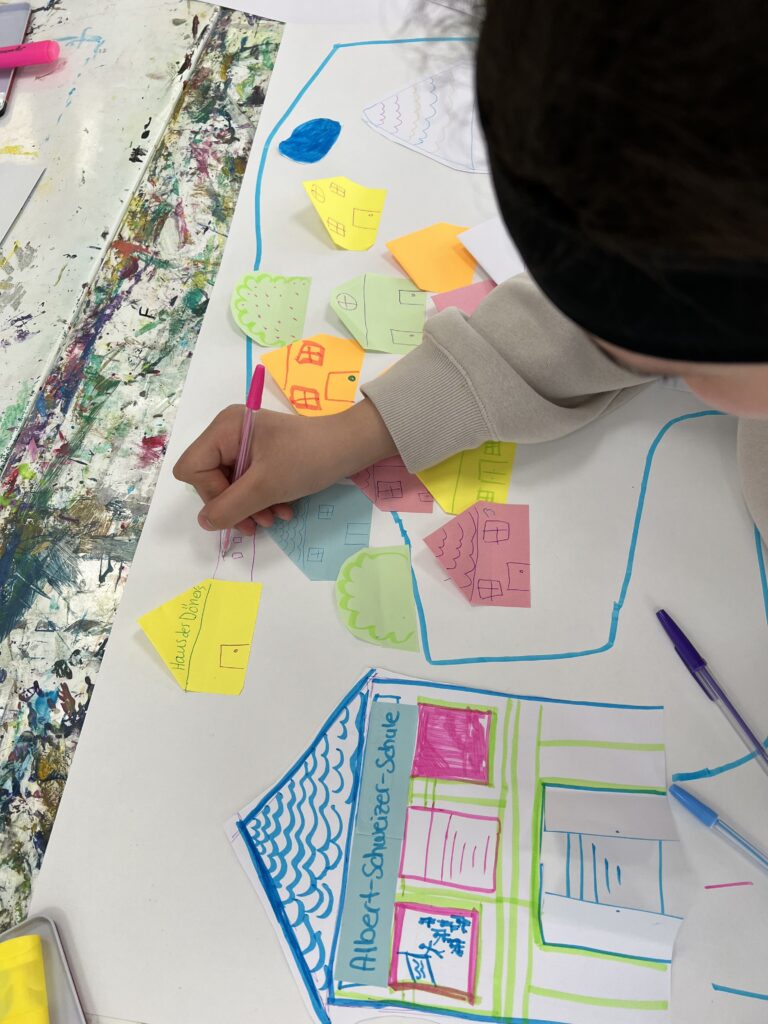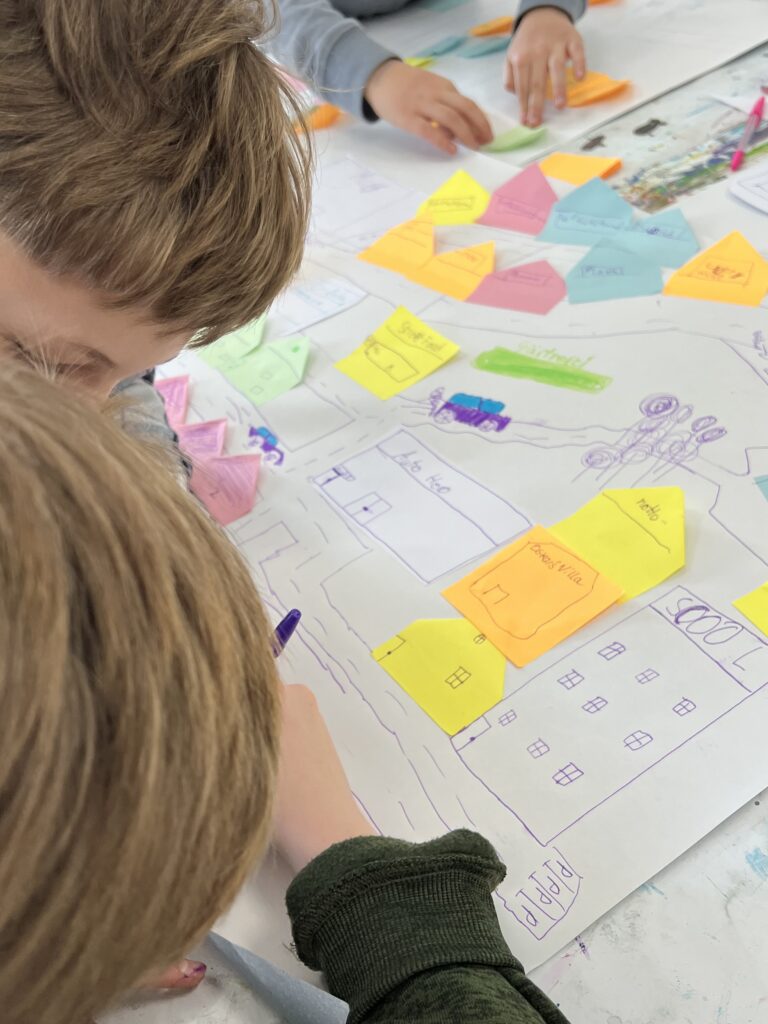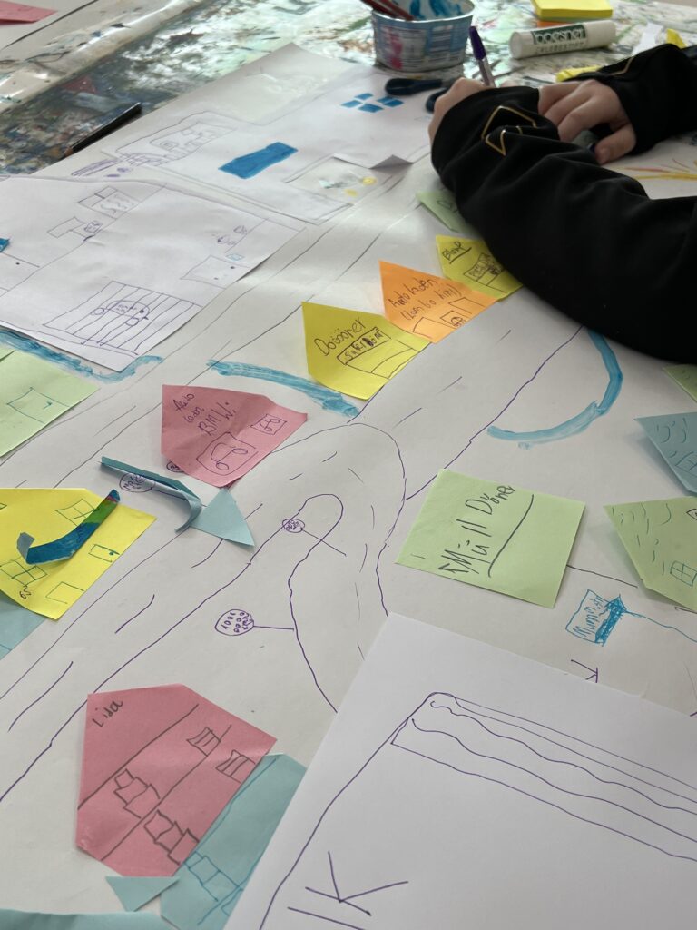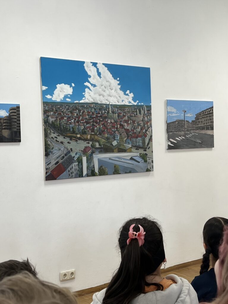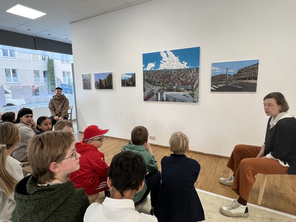 Am 09.03.2026 besuchte eine 4. Klasse im laufenden Schuljahr ein zweites Mal den Kunstvermittlungsraum Kunstsprung. Dieses Mal war der Osnabrücker Künstler Henning Bischof zu Gast, der 5 seiner Werke mitgebracht hatte. Alle Werke waren von Häusern inspiriert, zwei zierten sogar den Schüler*innen bekannte Locations in Osnabrück – einmal die Altstadt mit dem Heger Tor und zudem der Rosenplatz. Davon inspiriert begannen die jungen Künstler*innen in Zweierteams eigene Städte zu kreieren. Eines hatten alle Städte gemeinsam, eine hohe Anzahl an Restaurants oder Imbissbuden …. Möglich gemacht haben den Besuch zum einen die Stiftung der Sparkasse und die Egerland-Stiftung.