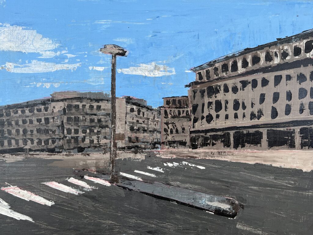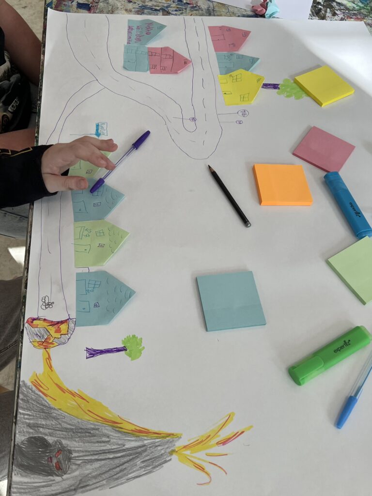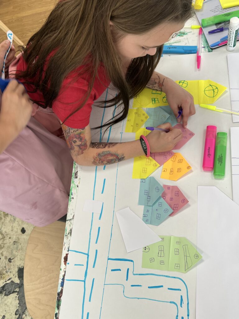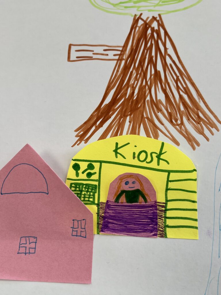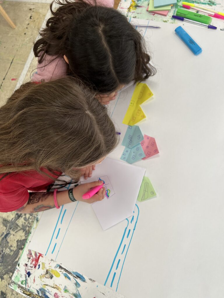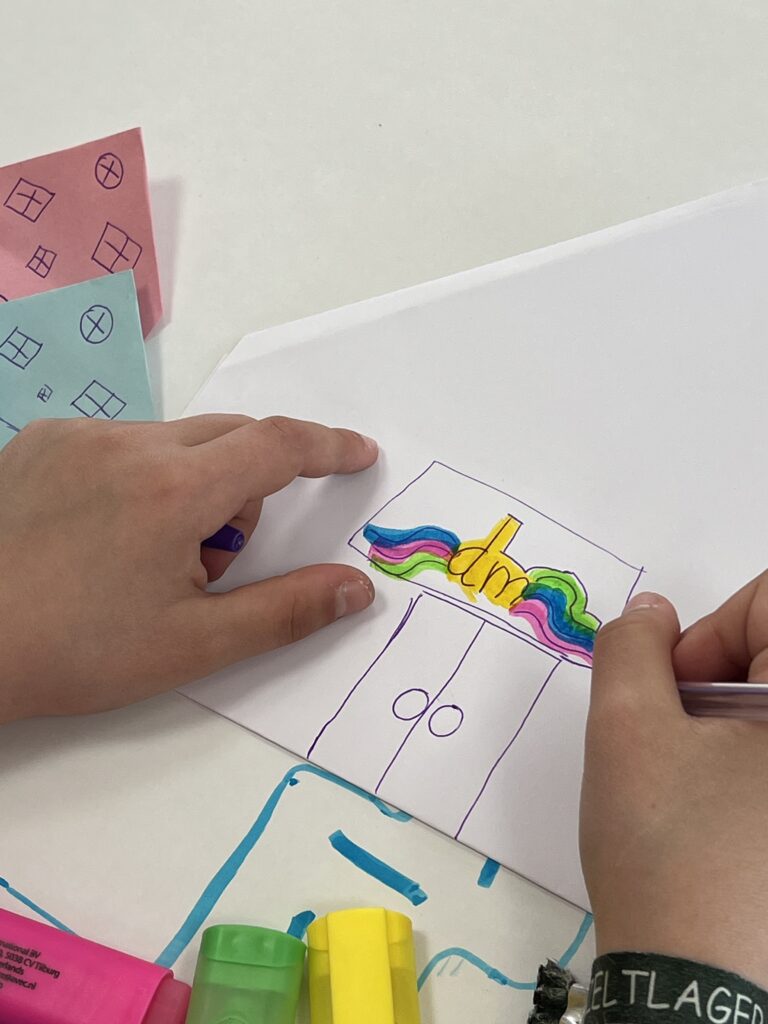 Am 09.03.2026 besuchte eine 4. Klasse im laufenden Schuljahr ein zweites Mal den Kunstvermittlungsraum Kunstsprung. Dieses Mal war der Osnabrücker Künstler Henning Bischof zu Gast, der 5 seiner Werke mitgebracht hatte. Alle Werke waren von Häusern inspiriert, zwei zierten sogar den Schüler*innen bekannte Locations in Osnabrück – einmal die Altstadt mit dem Heger Tor und zudem der Rosenplatz. Davon inspiriert begannen die jungen Künstler*innen in Zweierteams eigene Städte zu kreieren. Eines hatten alle Städte gemeinsam, eine hohe Anzahl an Restaurants oder Imbissbuden …. Möglich gemacht haben den Besuch zum einen die Stiftung der Sparkasse und die Egerland-Stiftung.