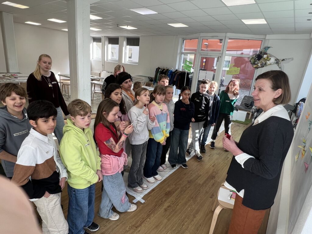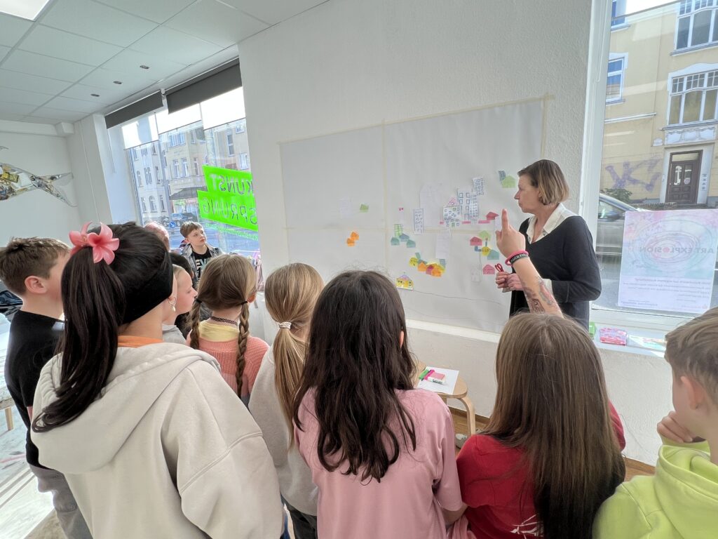 Eine 4. Klasse hatte das große Glück im laufenden Schuljahr im September 2025 einen Platz im aktuellen Kurs von Birgit Kannengießer im Kunstvermittlungsraum „Kunstsprung“ zu bekommen. Eine Osnabrücker Künstlerin präsentierte zwei ihrer aktuellen Werke, die die kleinen Künstler aus dem 4. Jahrgang zum Anlass nahmen, selbst künstlerisch zu wirken. Mit Feuereifer und Begeisterung waren alle dabei und der Schulvormittag war schneller vorbei als erwünscht. Einen Dank geht an Birgit Kannengießer und die Egerland-Stiftung.