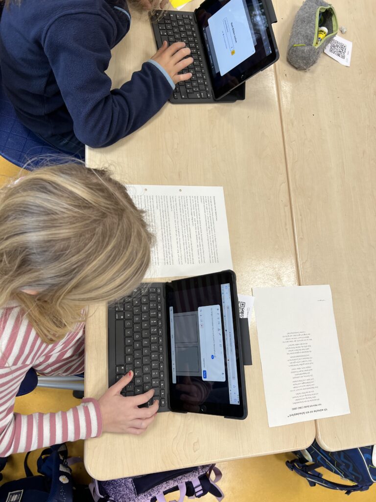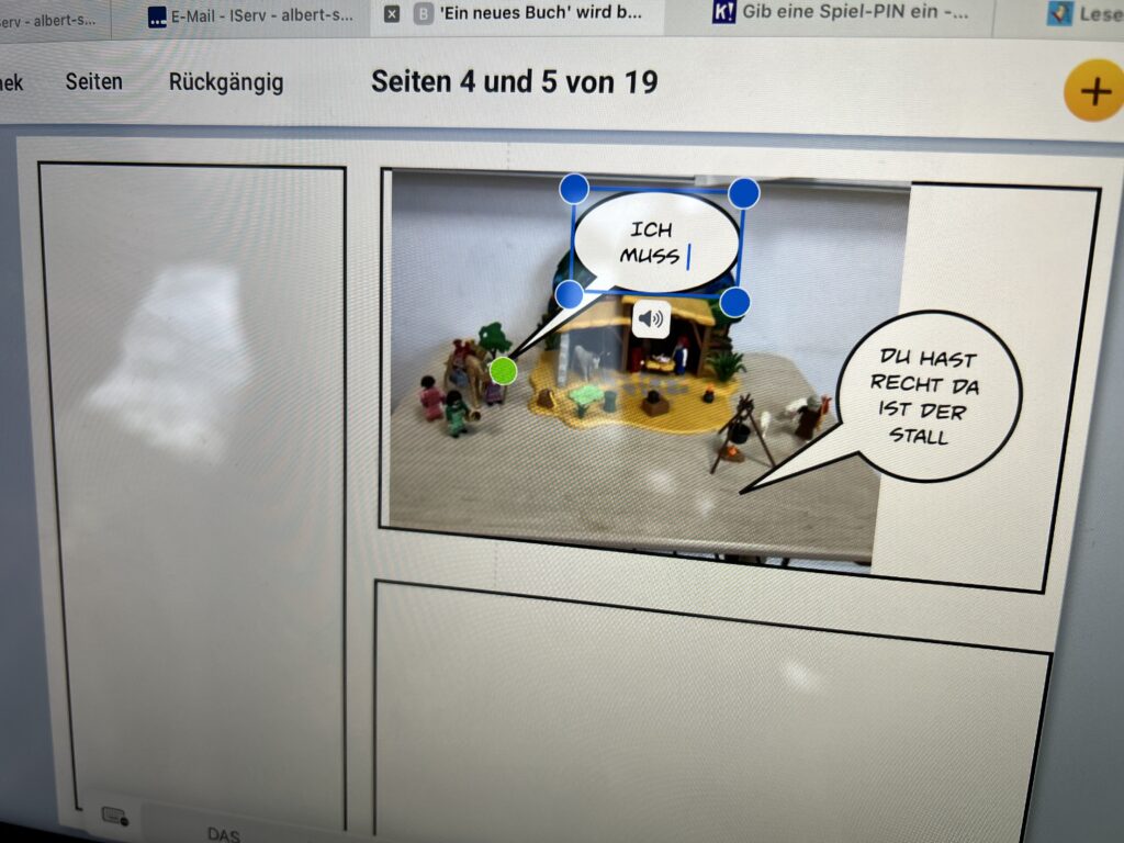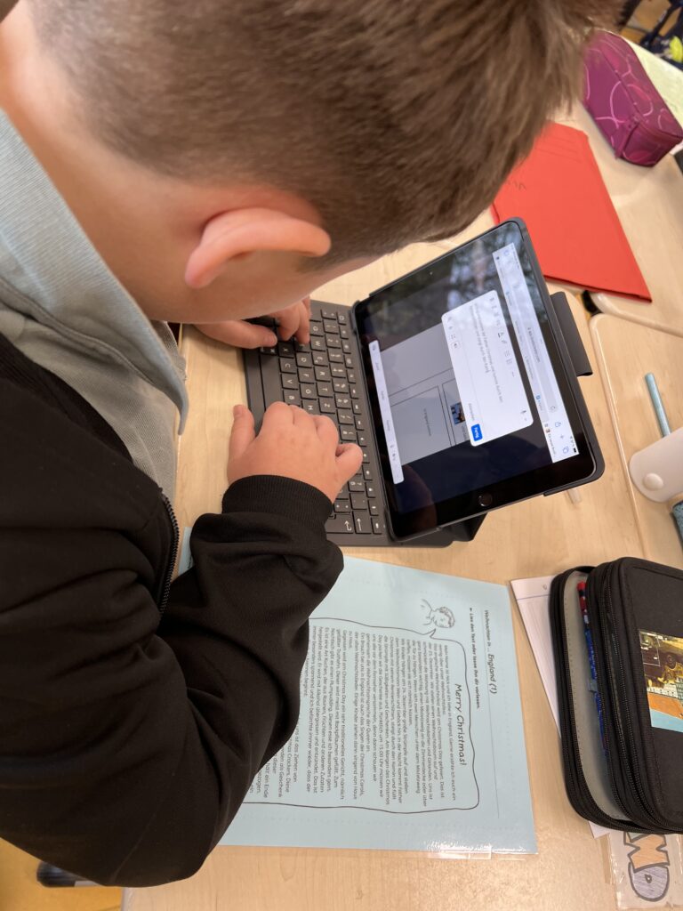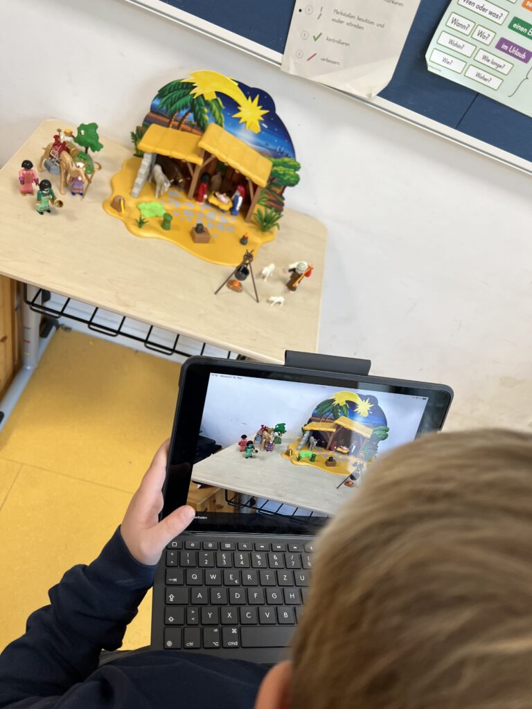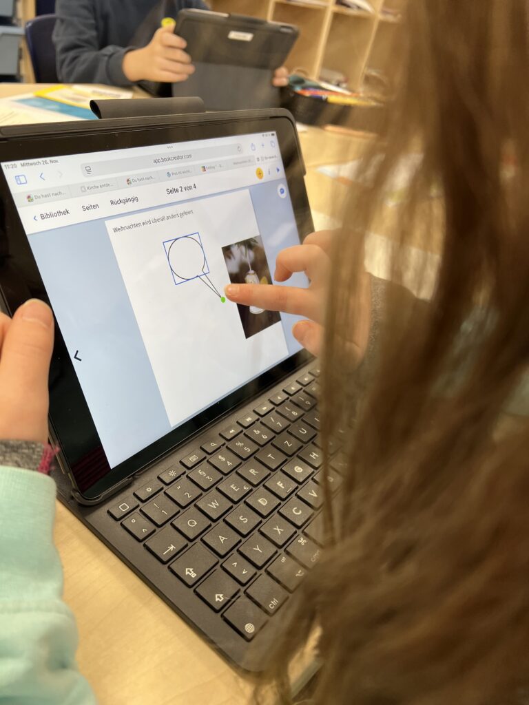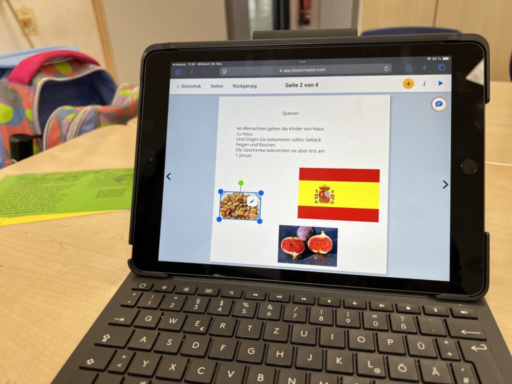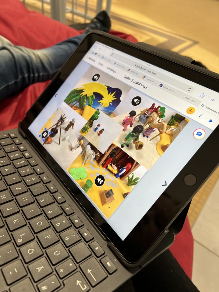 Im Religionsunterricht in Klasse 4 war das Thema „Weihnachten bei uns und in anderen Ländern“. Dazu sollten die Schüler*innen mit Hilfe der App „book-creator“ eigene kleine digitale Bücher erstellen, die zum einen die Weihnachtsgeschichte beinhalten sollten, zudem eine Beschreibung des Weihnachtsfestes in der eigenen Familie und die Vorstellung des Weihnachtsfestes in mindestens zwei weiteren Ländern.