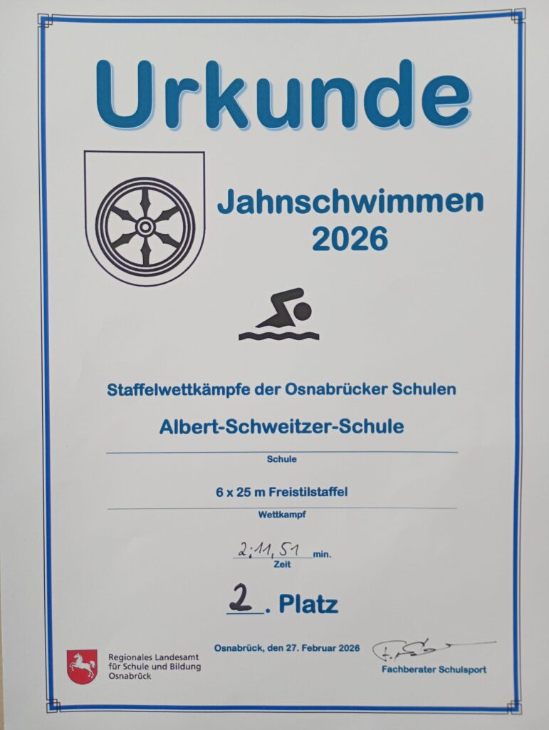 Beim diesjährigen Jahnschwimmen holten unsere beiden Schulstaffeln überragende Ergebnisse. Während die Bruststaffel mit Platz 6 aller Osnabrücker Grundschulen schon einen vorderen Platz belegen konnte, wurde die Freistilstaffel sogar ZWEITER ! Ein überragendes Ergebnis, auf das wir als Schulgemeinschaft enorm stolz sind. Gut gemacht, Ihr Wasserratten von der ASS !!!!