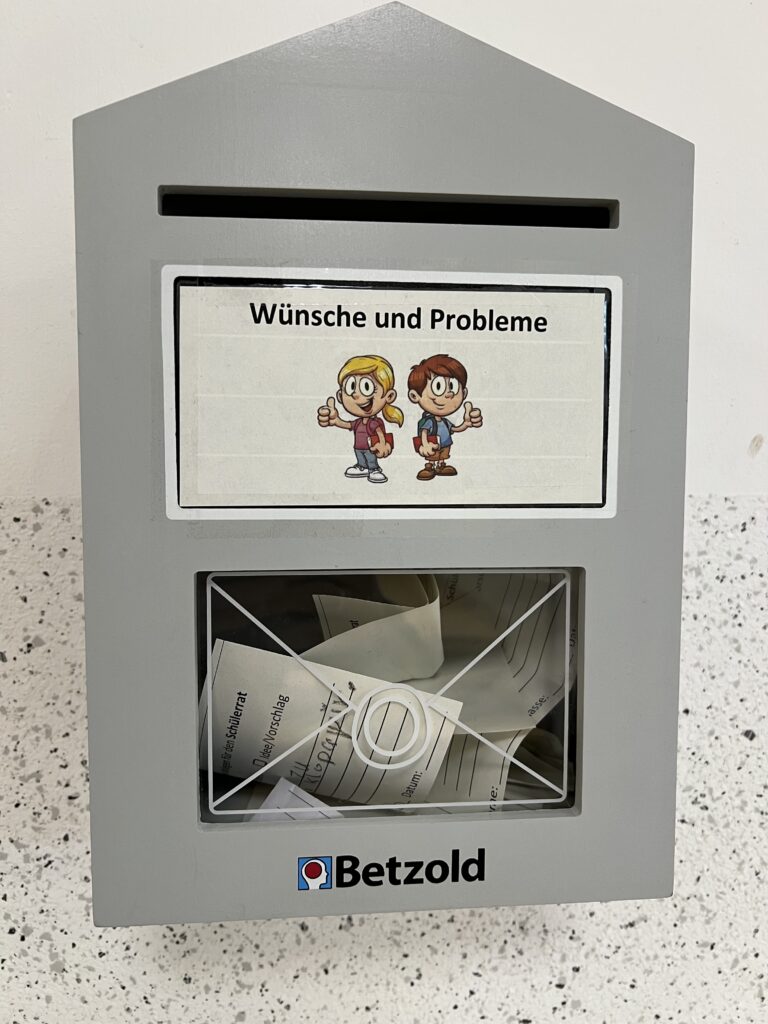 Zudem haben die Schülersprecher mit Frau Reyl gemeinsam eine Anschaffung eines „Wünsche und Probleme“-Kastens besprochen, der vom Schülerrat bei den jeweiligen Sitzungen immer geöffnet und ausgewertet wird, inwiefern sich dort wichtige Anliegen für den Schultag finden.