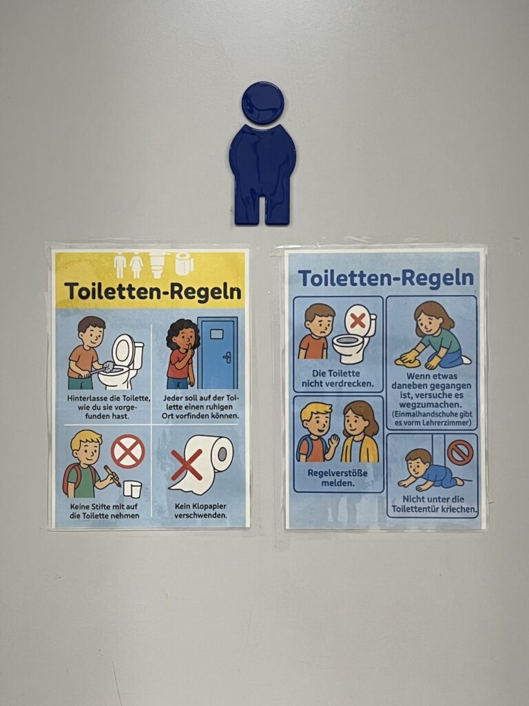 Nach spannenden Sitzungen in den Herbstmonaten, die von unseren Schülersprecher*innen Paula und Theo stets souverän geleitet werden, wurden Ende November erste Zeichen der intensiven Schülerratsarbeit sichtbar: Um alle Schüler*innen der Schule an die eigene Verantwortung für saubere Toiletten auch jeden Schultag erinnern zu können, haben die Klassensprecher*innen Regeln überlegt, die die beiden Schülersprecher dann zu Papier gebracht haben und inzwischen an allen Toilettentüren im Schulgebäude (und auch in den Räumen !) hängen.