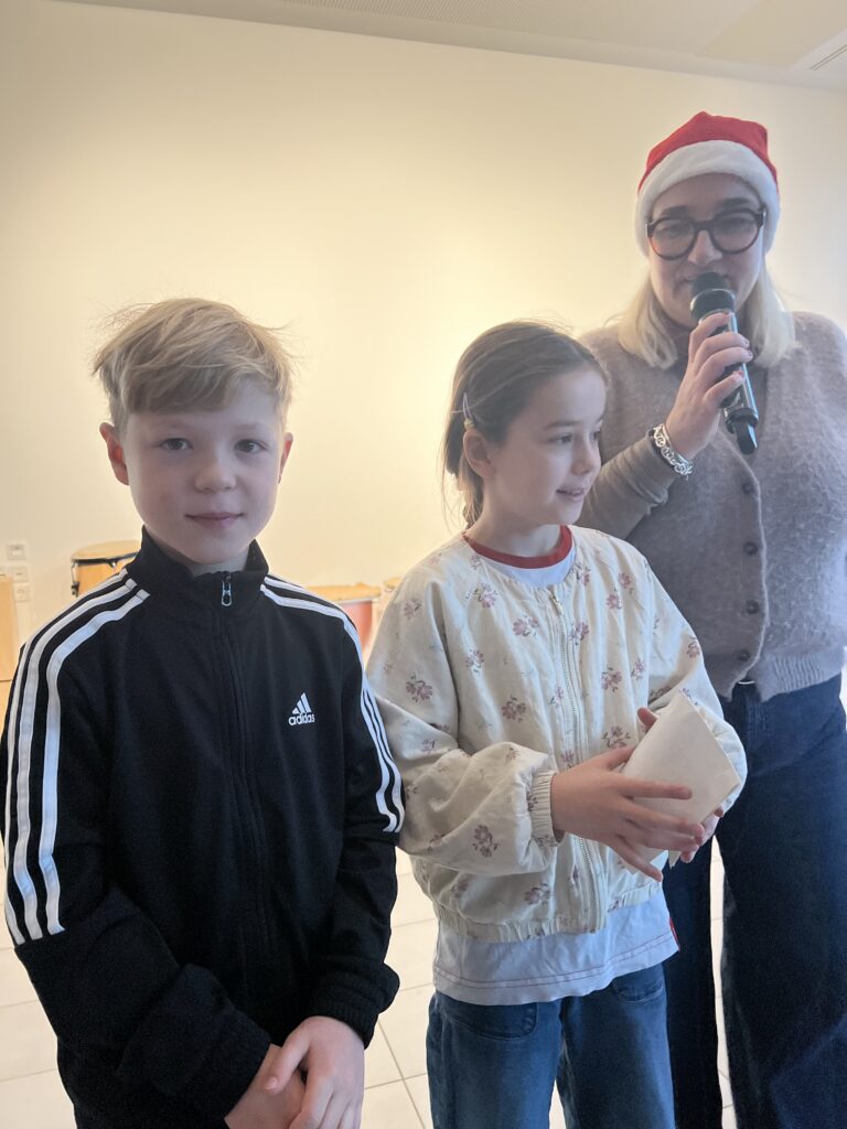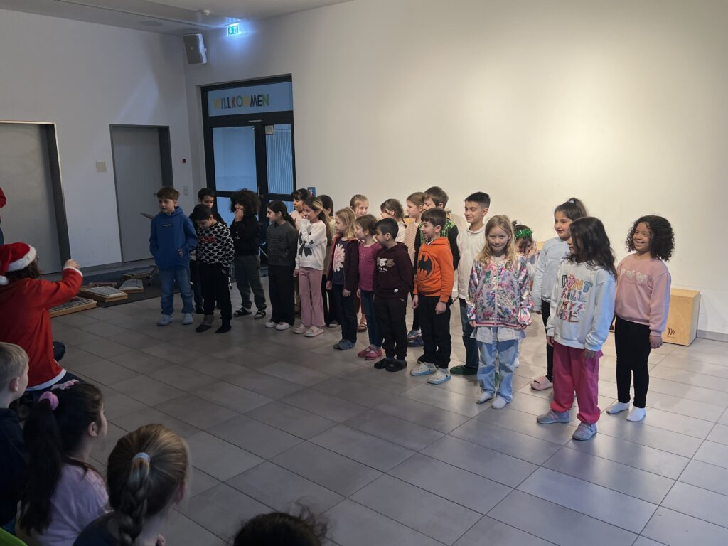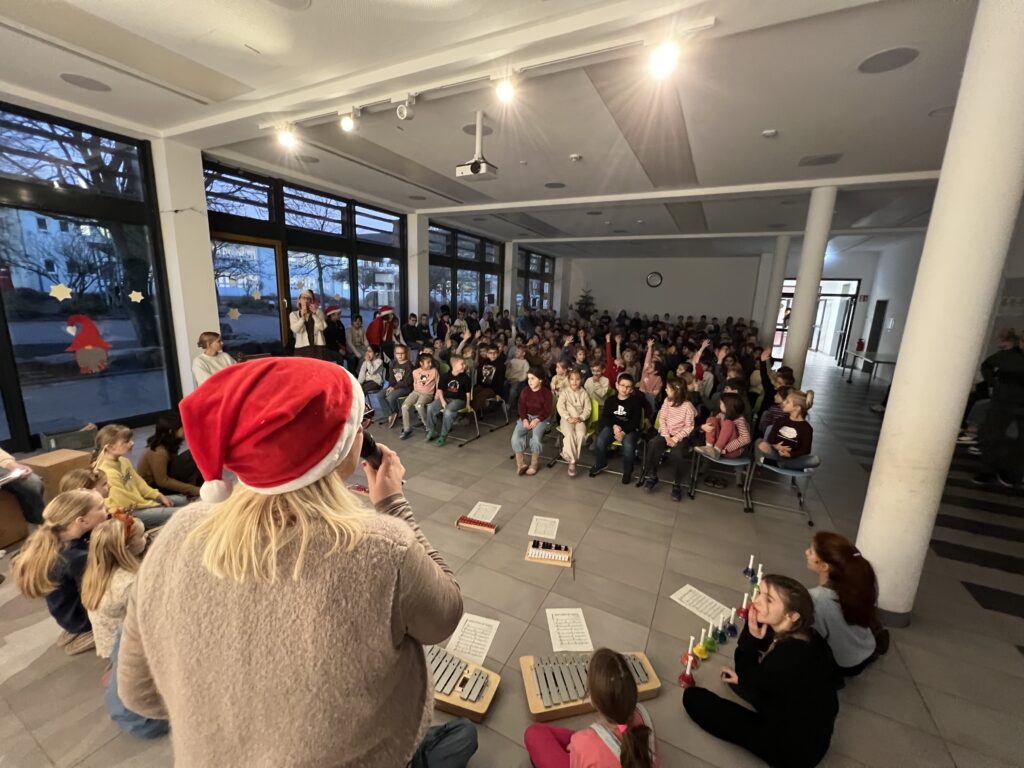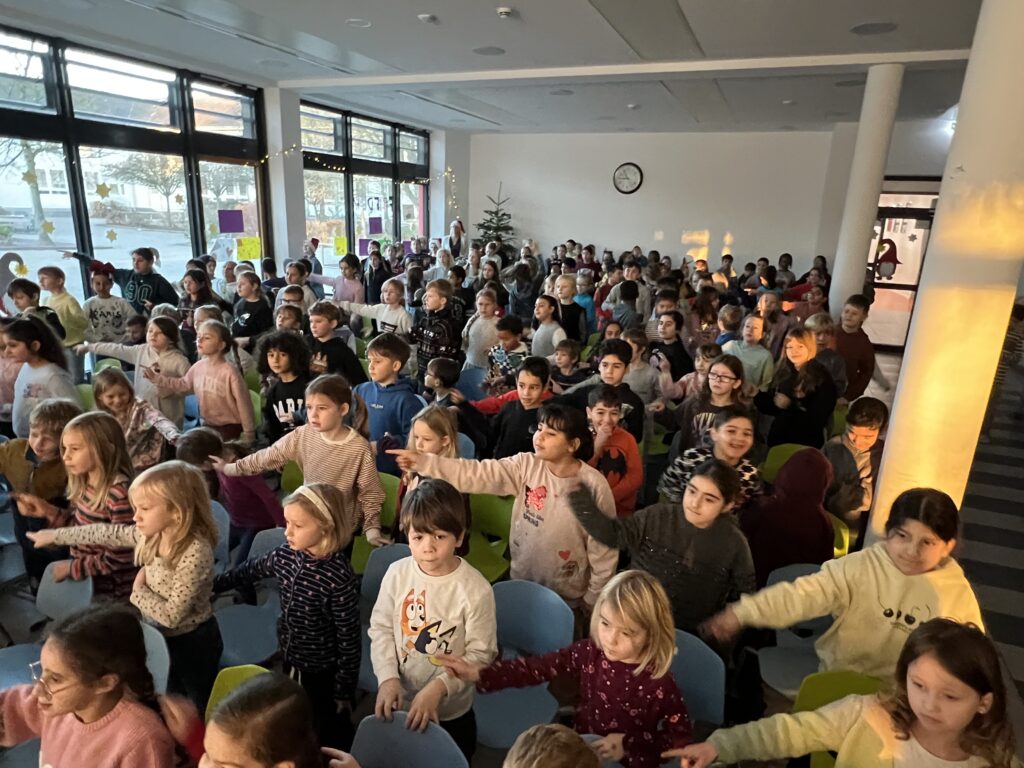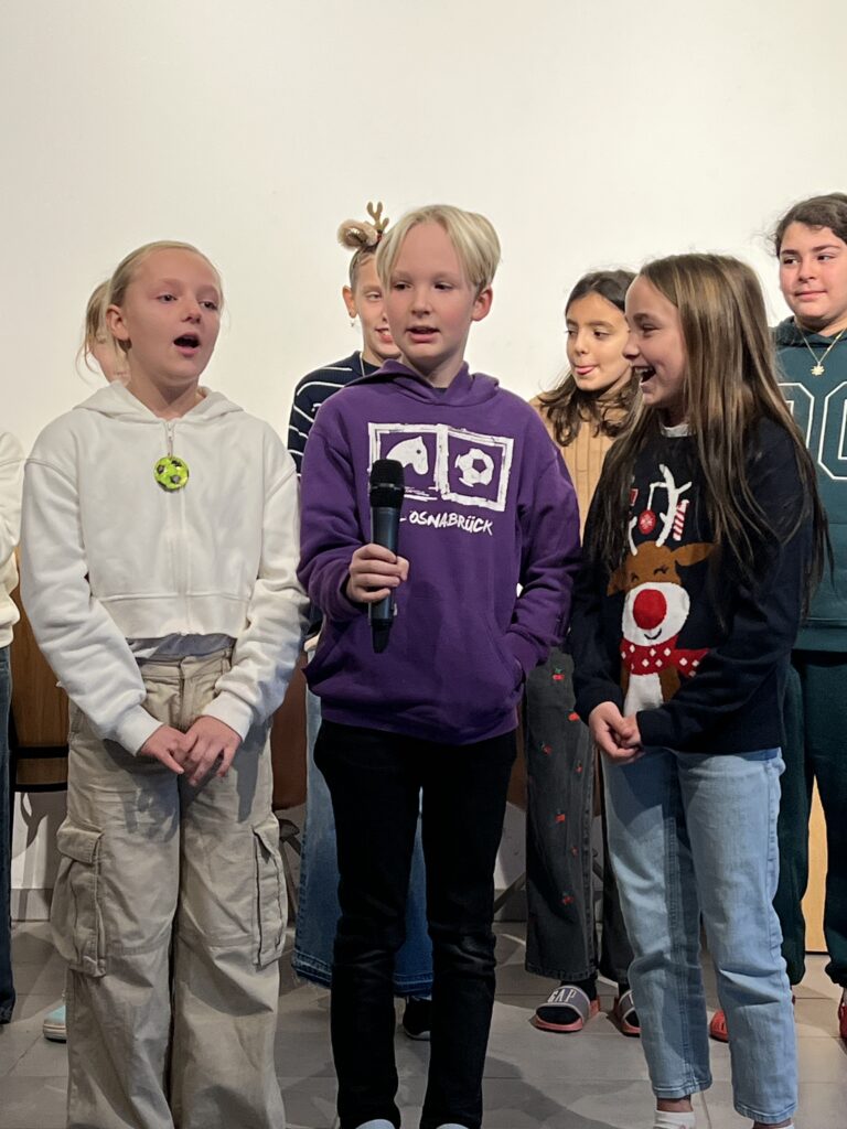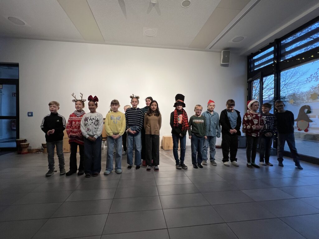 Am 15.12.2025 fand unsere schulinterne Weihnachtsfeier statt, zu der viele Schüler*innen im Schulalltag Beträge erarbeitet hatten. Frau Reyl begrüßte die Schulgemeinschaft und stellte das Moderatoren-Duo für die Veranstaltung vor, unsere Schülersprecher Paula und Theo.