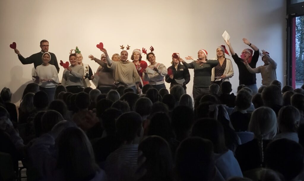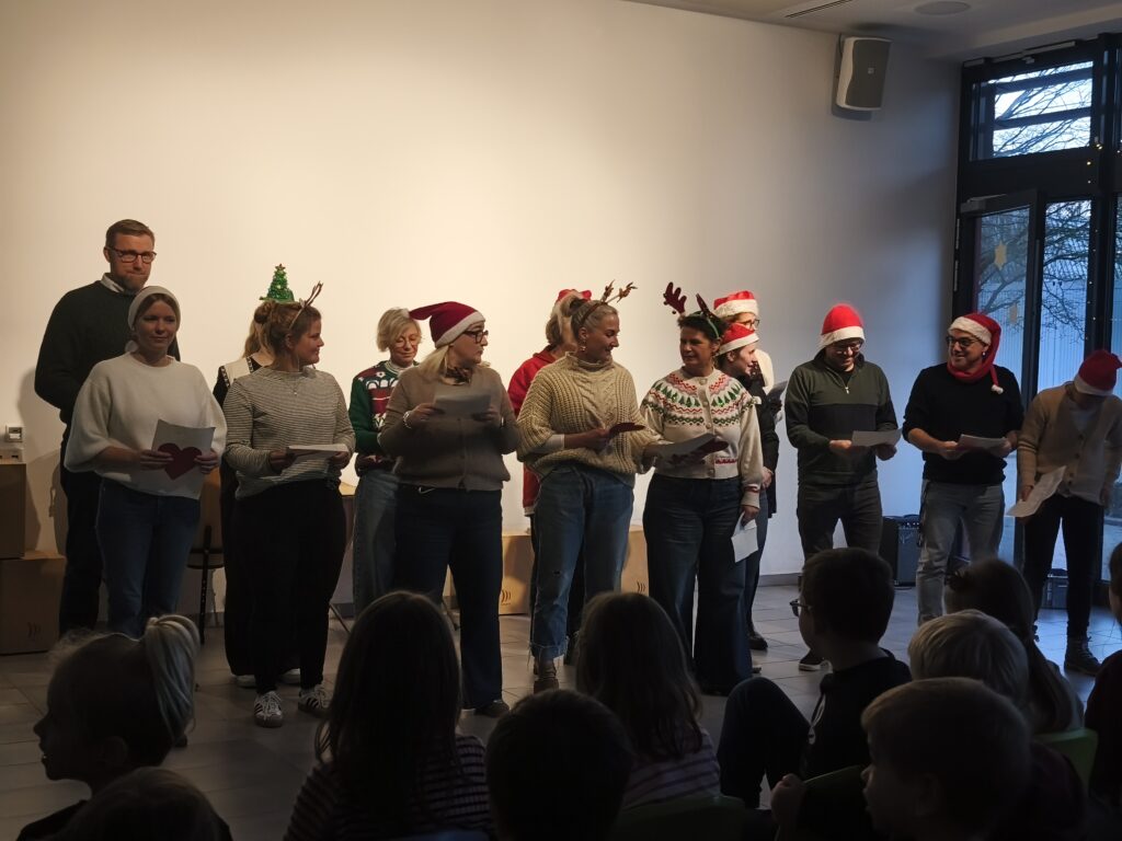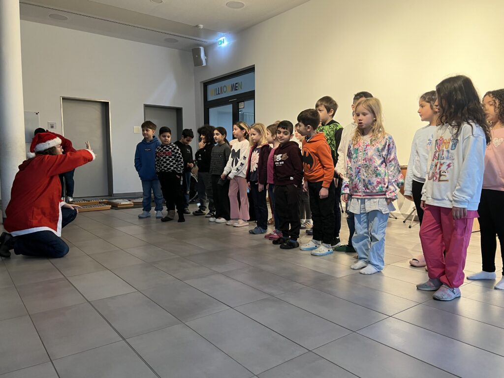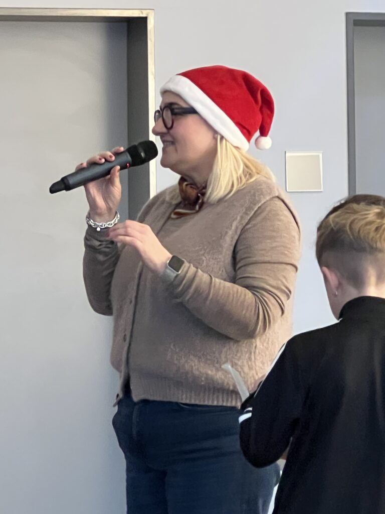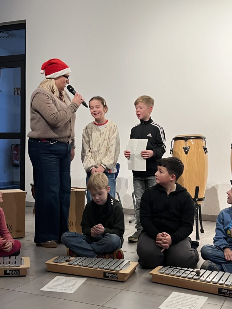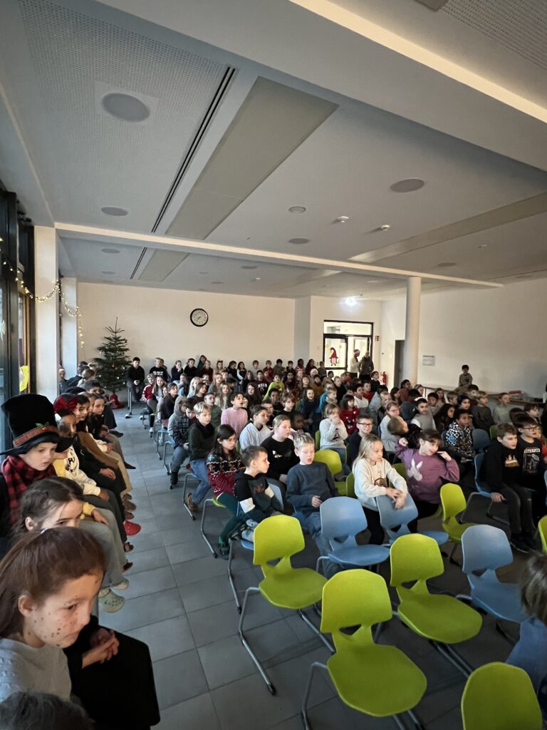 Am 15.12.2025 fand unsere schulinterne Weihnachtsfeier statt, zu der viele Schüler*innen im Schulalltag Beträge erarbeitet hatten. Frau Reyl begrüßte die Schulgemeinschaft und stellte das Moderatoren-Duo für die Veranstaltung vor, unsere Schülersprecher Paula und Theo.