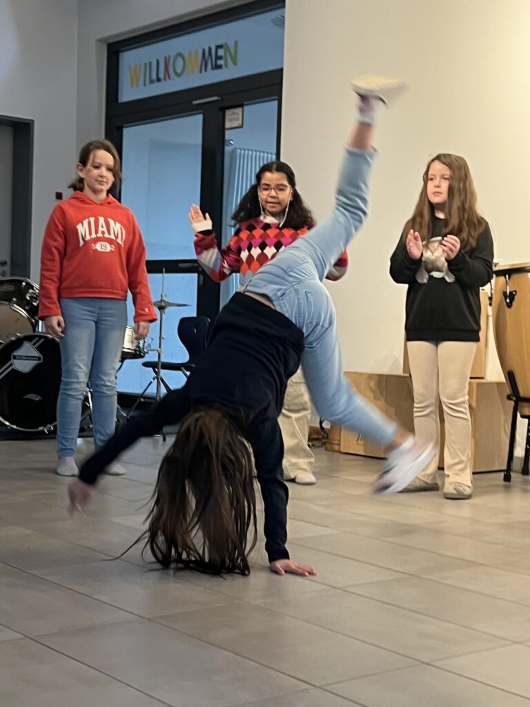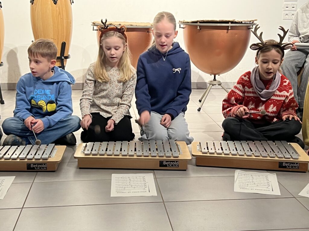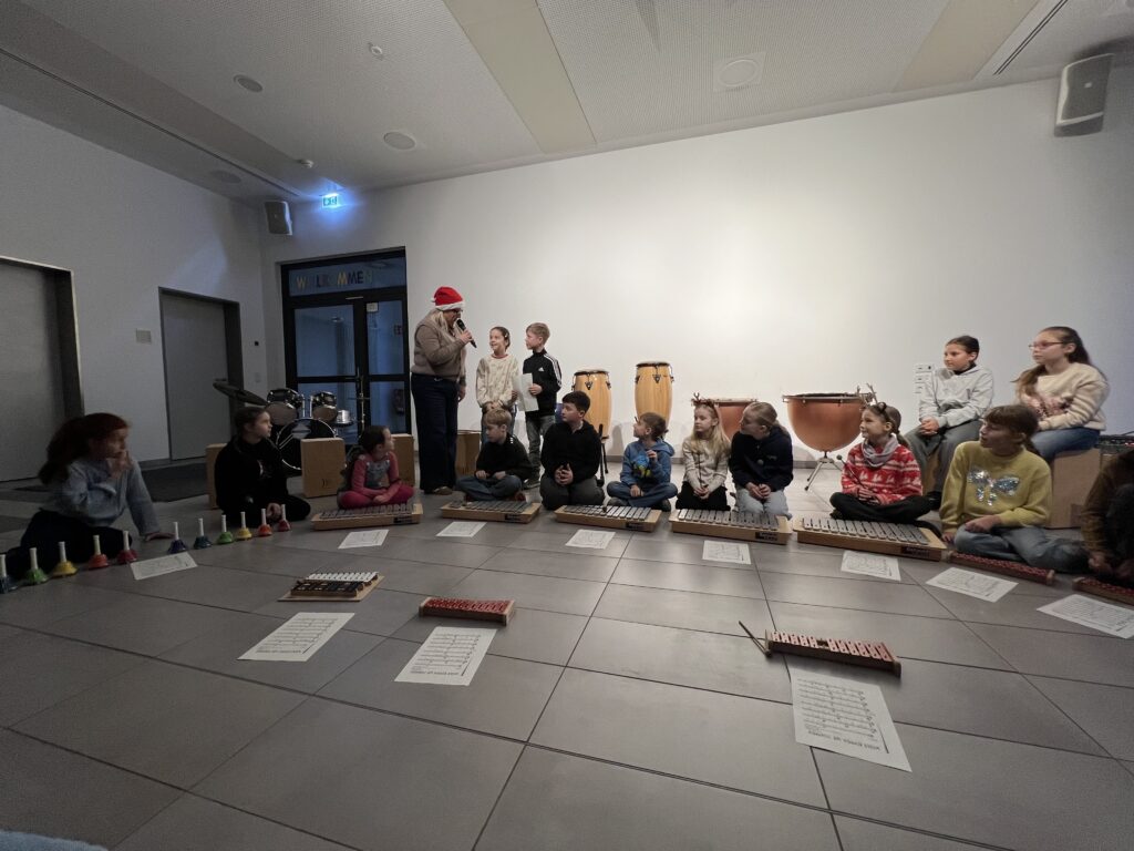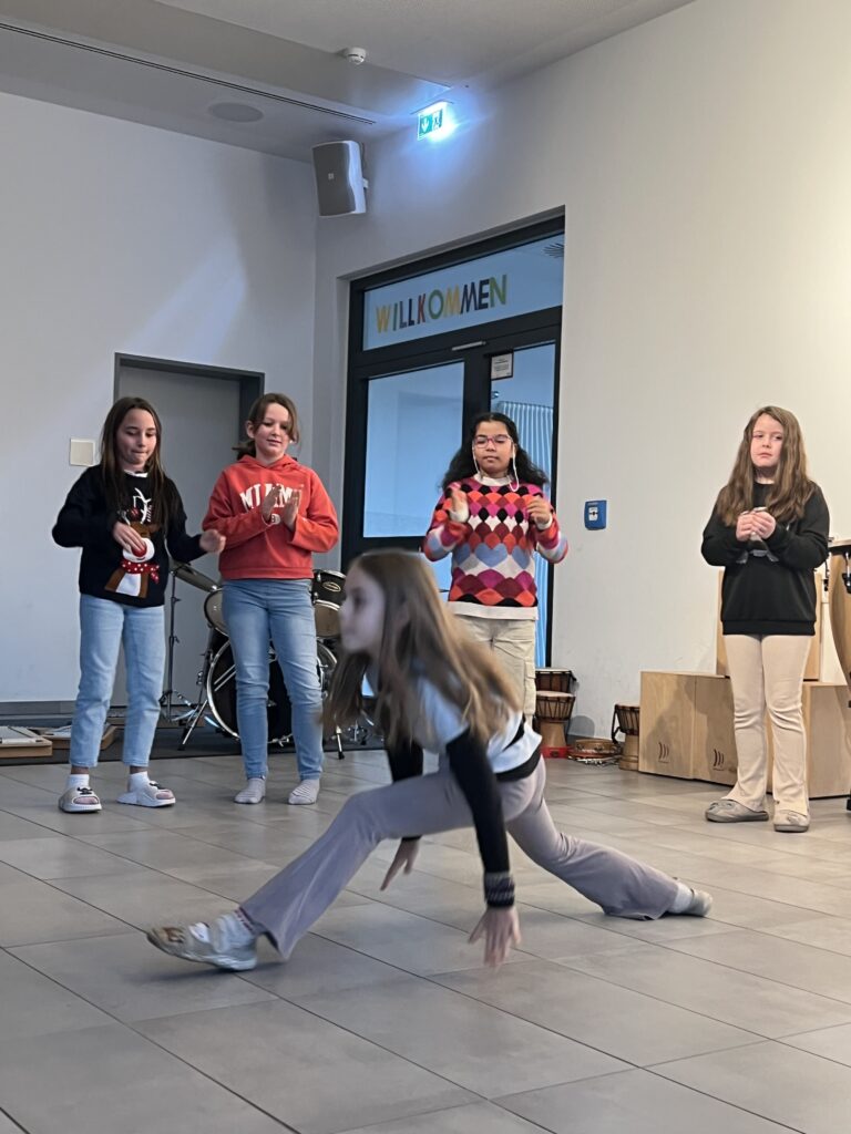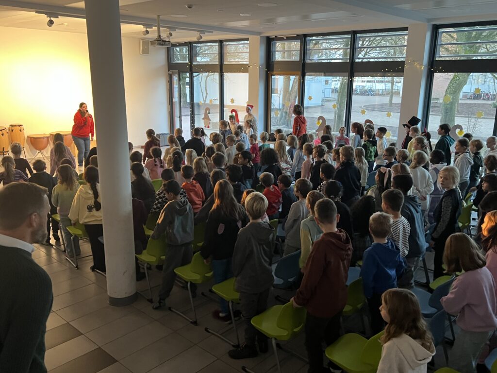 Als erstes sangen alle Klassen gemeinsam das Lied „Wieder kamen wir zusammen“, das von der Ensemble-AG begleitet wurde. Die Trommel-AG führt im Anschluss darauf ein fetziges Trommelstück vor. Die Klasse 4c hatte zwei weihnachtliche Gedichte vorbereitet („Ich wünsche mir ein Schaukelpferd“ und „Knecht Ruprecht“) und die Klasse 2b ein weihnachtliches Rhytmical zum Thema „Warten“ auf die Bescherung. Die Hip-Hop-AG – seit diesem Schuljahr neu im Ganztags-Angebot – zeigte daraufhin beindruckendes Können, was großen Applaus zur Folge hatte. Auch die Lehrer hatten sich nicht lumpen lassen und in mehrstündigen Proben (na fast …) das Lied „Last Christmas“ einstudiert, was zumindest ein halbminütiges „Zugabe – Zugabe“ seitens der Schülerschaft zur Folge hatte. Den Abschluss bildete noch mal ein weihnachtlicher Bewegungstanz für alle – initiiert von der Leiterin der Hip-Hop-AG.
